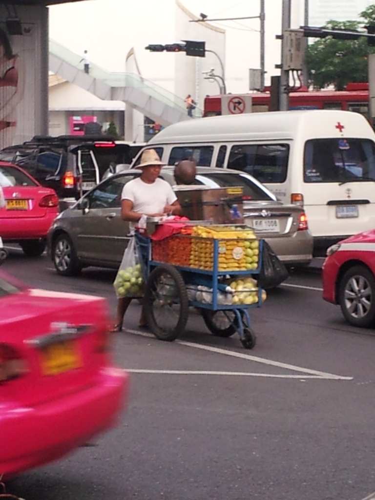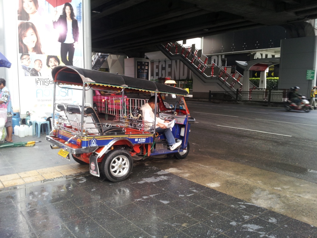 タイでは、それに加えて初めて自動車を購入する人に費用の一部を還付するという策をとっており、それが車の増加に拍車をかけたようである。 渋滞が発生するのは車の数が多いこともあるが、もう一つ運転マナーの問題があると思う。とにかく車線変更をやたらと行うことにあると思う。チョッとした隙間を見つけると車線を変更し、前が詰まってブレーキを踏むということの繰り返しである。一昔前の大阪の道路の光景が想い出された。 高速道をタクシーで走っていた時に、急ブレーキがかけられあわや追突というシーンに出くわしてしまった。これもやたらと車線変更を行ったためである。帰りの飛行機で、首にコルセットをしている人が居たが、顔色の悪さからバンコクで追突事故に巻き込まれて帰国したのではないかと想像された(いくら図々しい私でも聞くことは憚られた)。 タイの名物の一つであるトゥクトゥクにも夕食に出かける時に乗って見た。子どもの頃、ダイハツの三輪車(ミゼットが出る前)でビールや炭を配達しており、乗ったことがあるのだが60年近く前の話である。 子どものころを思い出しながら期待して乗ったのだが、乗り心地は最悪で、おまけに運転手が頻繁に車線変更を行うものだから尚更辛い乗り物だった。三輪車の特性なのか、カーブでは遠心力が強く働き支柱に捕まっていないと振り落とされそうだった。スリルを味わいたい人にはよいのだろうが、私のような憶病者には向かない乗り物だ。 客待ちをしているトゥクトゥク。この車は新車のようだ。